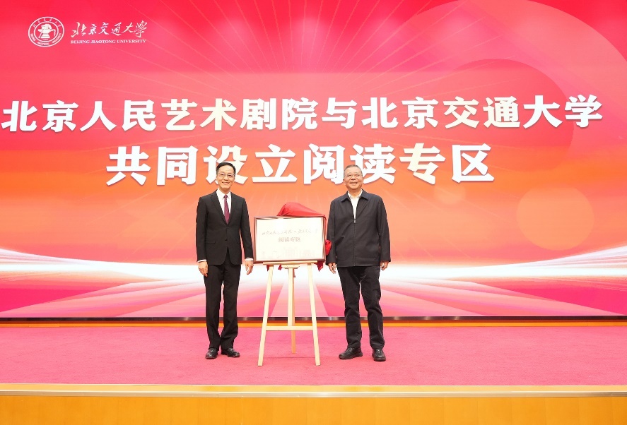 活动现场,北京交通大学党委书记陈子季与冯远征共同为“北京人民艺术剧院*北京交通大学‘传习读书社’阅读专区”揭幕,北京人艺为读书社捐赠系列丛书,为读书社建设与学校美育注入新资源。