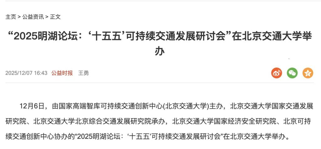 12月6日,由国家高端智库可持续交通创新中心(北京交通大学)主办,北京交通大学国家交通发展研究院、北京交通大学北京综合交通发展研究院承办,北京交通大学国家经济安全研究院、北京可持续交通创新中心协办的“2025明湖论坛:‘十五五’可持续交通发展研讨会”在北京交通大学举办。