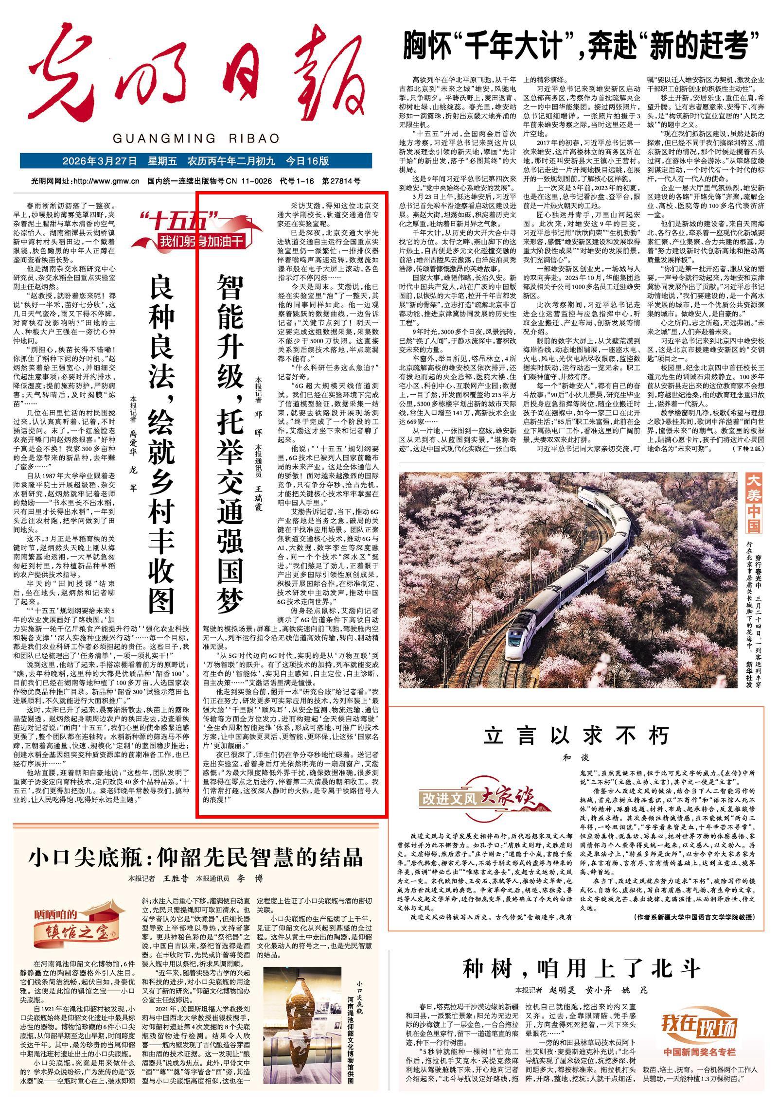 2026年3月27日,光明日报头版十五五专栏【“十五五”我们躬身加油干】报道我校副校长艾渤教授带领团队,围绕6G超大规模天线信道等“卡脖子”难题矢志攻关的事迹,生动诠释了新时代科研工作者把论文写在祖国大地上的实干与担当。全文刊载如下: