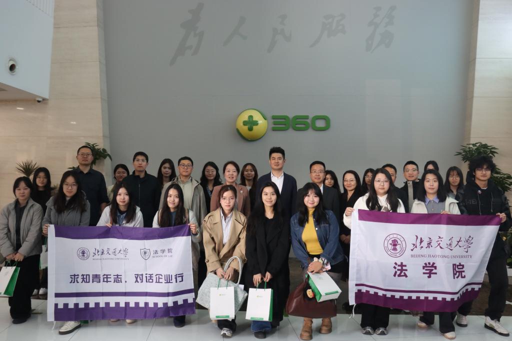 为进一步深化校企合作,3月31日下午,北京交通大学法学院党委书记兼院长张立学一行赴360集团开展“求知青年志,对话企业行”走访调研。360集团高级副总裁、数字安全集团总裁、我校法学院院友胡振泉、集团北京办公室负责人卢夏平、360数字安全集团战略研究院院长耿贵宁以及有关同志参加座谈。学院党委副书记副院长秦莹、副院长裴洪辉、民商经济法系教授吴文嫔、团委书记李兴友以及本研师生30余人参加活动。