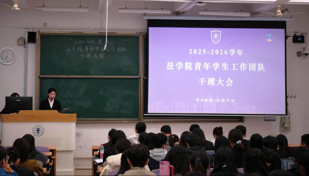 为强化学院本研学生骨干的理论基础、实践本领、责任意识,提升学生工作团队引领青年、服务青年、组织青年的工作实效,10月17日,法学院在思源西楼107教室召开2025-2026学年青年学生工作团队干理大会。法学院党委副书记、副院长秦莹、团委书记李兴友、各社团指导教师、青年学生工作团队全体成员参加。
