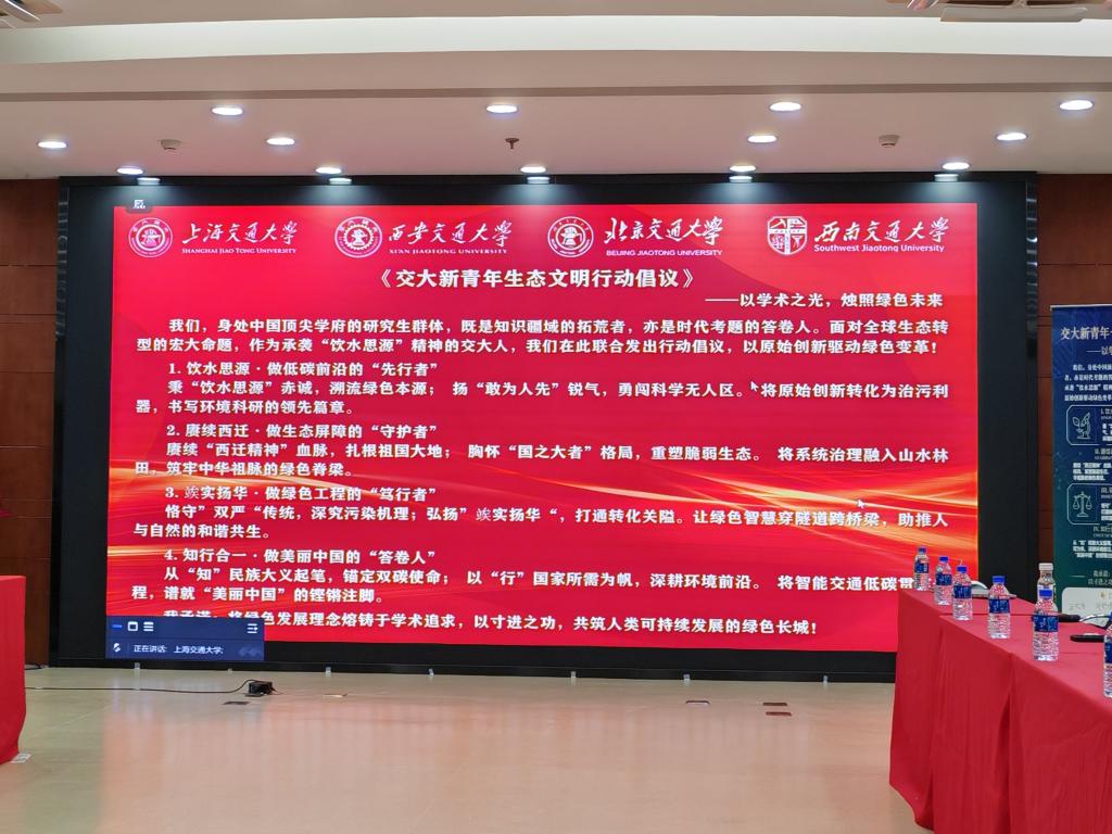 2025年12月14日,北京交通大学、上海交通大学、西安交通大学、西南交通大学四所交大青年学子汇聚云端启动了四校“聚‘交’青年担使命,联学‘两山’启新程”环境学科学生系列党建共建活动。北京交通大学环境学院党委书记向宏军、上海交通大学环境科学与工程学院党委书记郑浩、西安交通大学人居环境与建筑工程学院党委书记杨鹏、西南交通大学环境科学与工程学院党委书记甘霖出席本次活动。我校马克思主义学院教师李家瑞、环境学院学工办主任兼院团委书记徐春玲、本科生辅导员李峥在我校线下分会场参加活动,环境学院博士生党支部书记马郡鸿任我校线下分会场主持人。