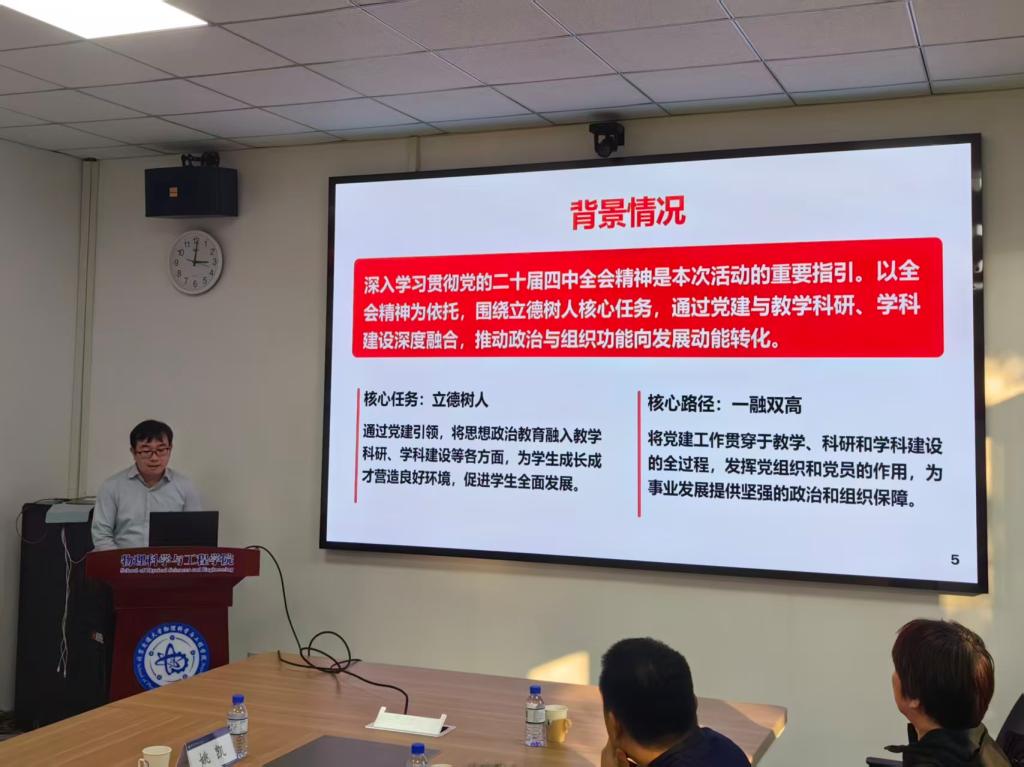 党支部书记杨一君以《强根铸魂 以高质量党建引领高质量发展》为题讲授党课,总结系所发展及支部“十四五”建设成果。支部以标准化建设筑牢思想根基,党建赋能教学科研融合,学科、育人成果丰硕。未来,支部将抢抓雄安新校区建设机遇,凝聚合力聚焦一流专业建设,筑牢教学、科研、导学、安全四条防线,助力系所工作迈上新台阶。