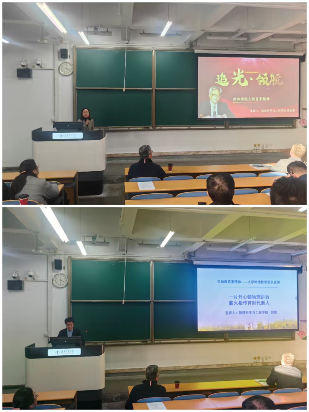 随后,学院两位教育家精神宣讲团成员进行了现场宣讲,以鲜活事迹诠释教育家精神。学工办主任周彦君以《追光·领航——徐叙瑢院士精神》为题,讲述我国发光学奠基人徐叙瑢院士至诚报国、求是创新的感人事迹。2025年学校“三育人”标兵获奖者郑凯以《一片丹心铸物理讲台薪火相传育时代新人》为题,回溯大学物理教学团队成长历程,讲述在王玉凤等老一辈教师引领下深耕讲台、传承育人初心的坚守故事。