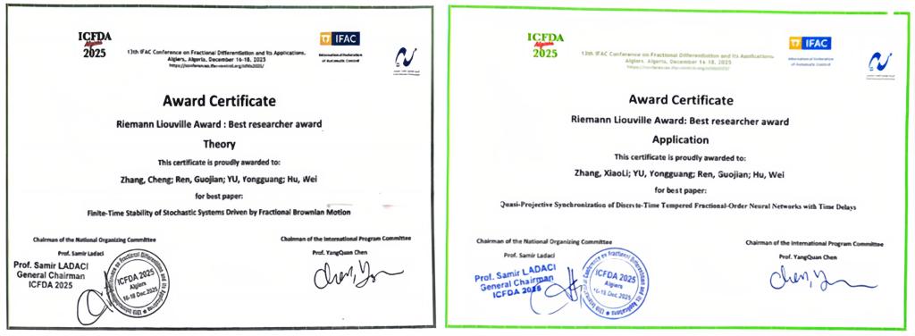 其他两篇参会论文《Finite-Time Stability of Stochastic Systems Driven by Fractional Brownian Motion 》和《 Quasi-projective Synchronization of Discrete-time Tempered Fractional-order Neural Networks with Time Delays》分别荣获 Riemann Liouville Award: Best researcher award (Theory) 和Riemann Liouville Award: Best researcher award (Application),旨在表彰在分数阶理论和应用研究中取得突出成果的优秀研究者,每次会议评选优秀论文不超过5篇。