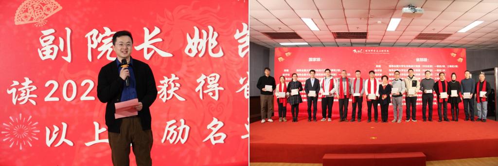 “聚力争今朝” 篇章,表彰与迎新环节温情满满。副院长姚凯宣读 2025 年度获省部级以上奖励教师名单,王玉凤老师、丁鹏玉处长为获奖教师分批颁发奖品,表彰他们在教学科研领域的突出贡献,营造了崇尚先进、争当先锋的良好氛围。