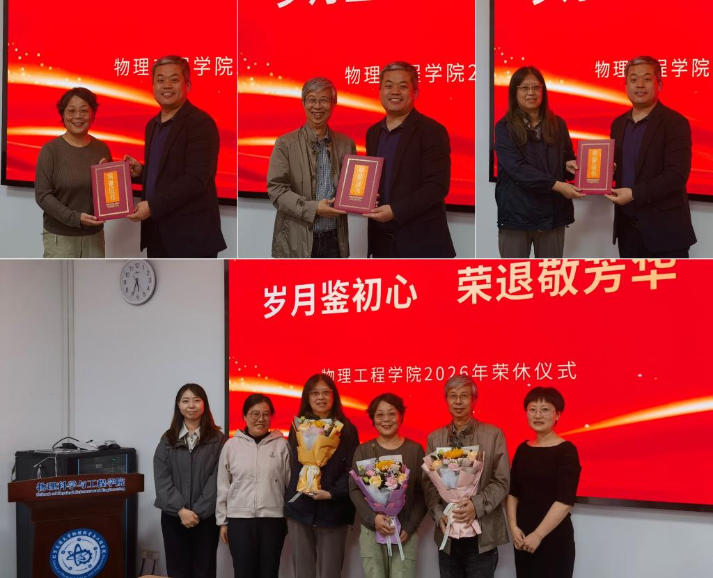 4月22日下午,物理科学与工程学院为牛原、滕永平和胡易三位退休教师举办荣休仪式,学院党委书记刘颖、院长彭继迎以及教师代表参加了此次仪式。