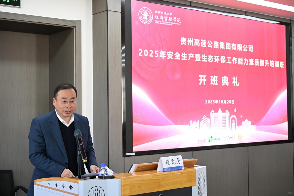 2025年10月20日上午,贵州高速公路集团有限公司2025年安全生产暨生态环保工作能力素质提升培训班开班典礼在北京交通大学思源东楼举行。北京交通大学党委常委、副校长施先亮,经济管理学院党委书记李彤,贵州高速集团党委委员、副总经理杨光勇,安全总监凌海峰出席典礼仪式。