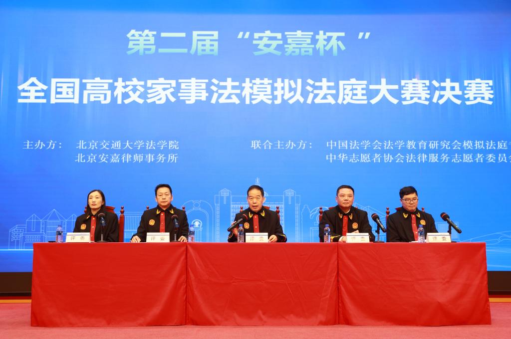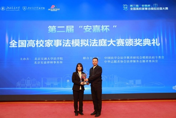 2025年12月7日下午,由我校法学院和北京安嘉律师事务所主办第二届“安嘉杯”全国高校家事法模拟法庭大赛决赛暨颁奖典礼在我校科学会堂落幕。副校长艾渤,中国法学会婚姻家庭法学研究会常务副会长龙翼飞,中国法学会《民主与法制时报》总编辑强梅梅,中华志愿者协会法律服务志愿者委员会执行主任李奎,中国法学会法学教育研究会模拟法庭教学专业委员会秘书长李晓,北京交通大学法学院党委书记张立学,北京安嘉律师事务所主任赵丽等出席决赛暨颁奖典礼。
