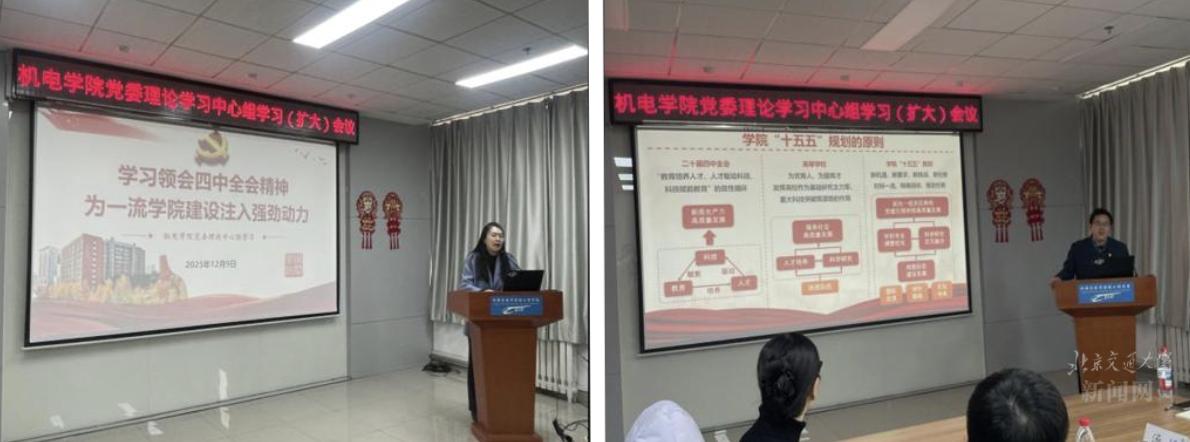 魏旺强分享学习二十届四中全会精神的体会并作总结发言。他表示,学院党委将坚决落实学校党委决策部署,把二十届四中全会精神切实转化为行动方案,以建设国内一流机械学院为奋斗目标,高质量编制学院“十五五”发展规划,牢牢把握一校多区发展新机遇,以实干担当推动学院事业更好发展。