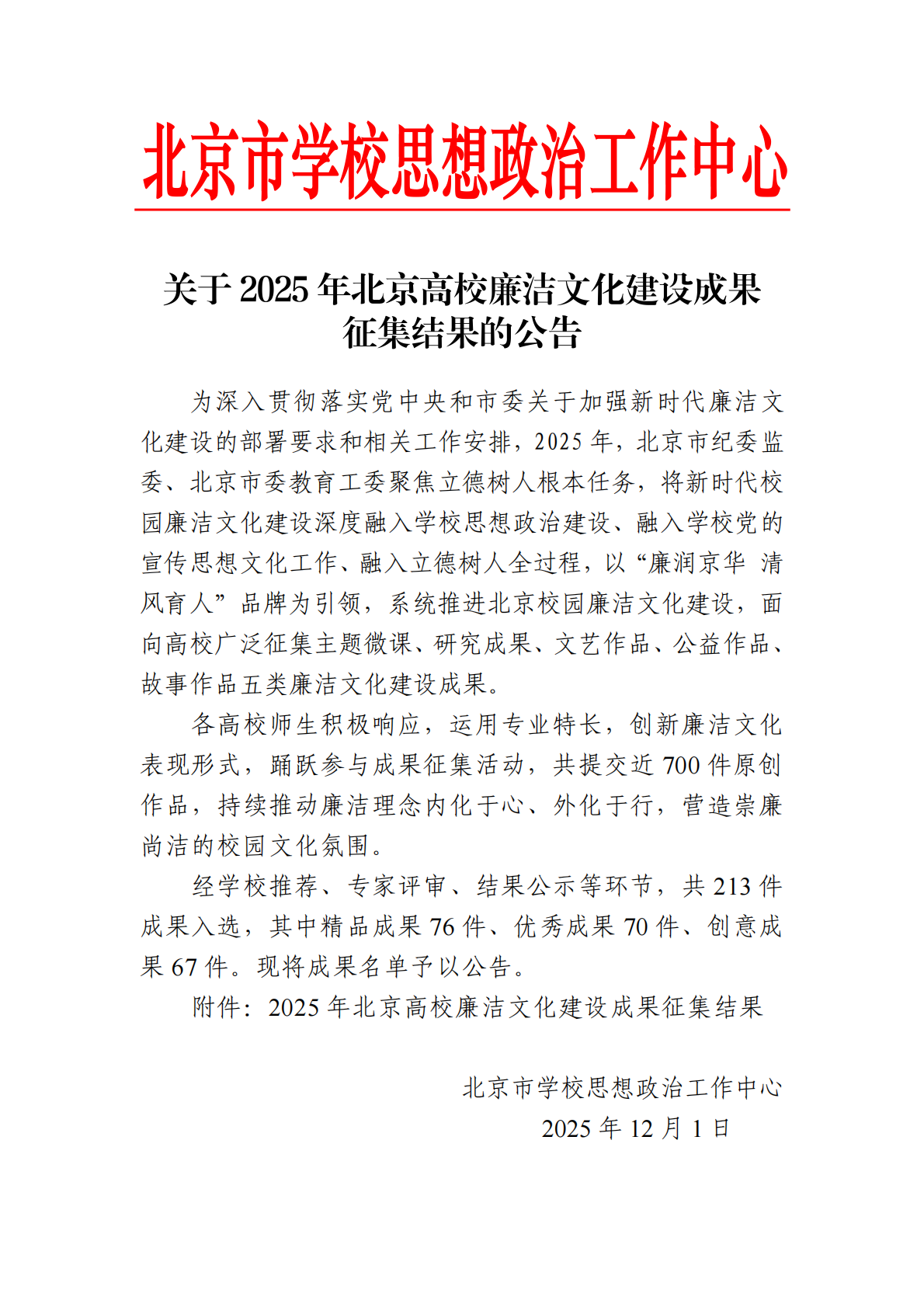 近日,北京市学校思想政治工作中心发布了《2025年北京高校廉洁文化建设成果征集结果公告》,我校9件作品获奖,其中3个作品获精品奖、3个作品获优秀奖、3个作品获创意奖,获奖数量和层级在北京高校中位居前列。获奖情况如下: