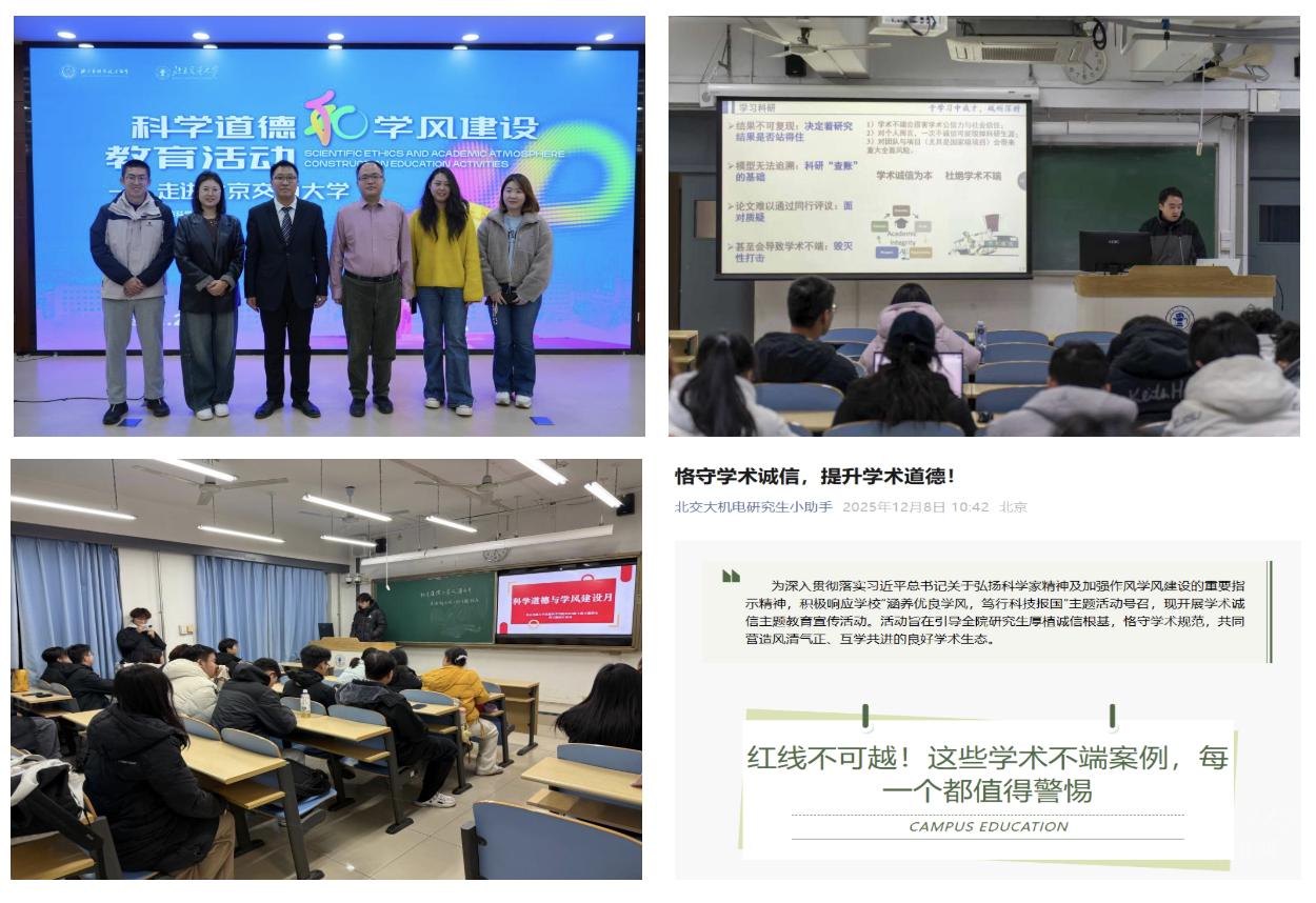 持续强化科研诚信教育,联合北京市科协举办科学道德和学风建设宣讲活动,邀请专家学者围绕AI伦理边界、科研诚信规范等话题展开交流分享。联合电信学院举办“知信行诚”学术诚信知识竞赛,吸引约2000名研究生参与,以赛促学,引导研究生系好学术生涯“第一粒扣子”。智能学院组织各研究生党支部及科研团队集中学习《高等学校预防与处理学术不端行为办法》,系统解读科研选题、数据记录等全流程规范。软件学院结合学科特点,围绕“代码抄袭、论文一稿多投”等典型案例开展专题警示教育,将学术规范教育前置到科研入门阶段,引导学生筑牢诚信防线。