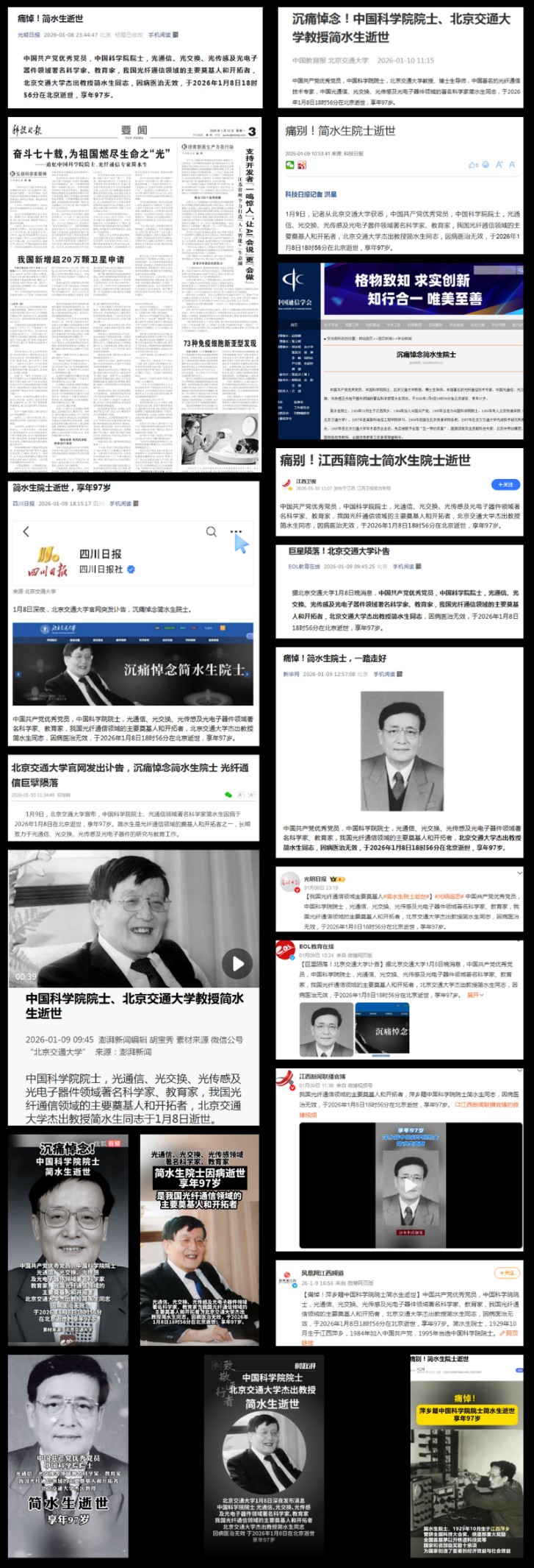 中国共产党优秀党员,中国科学院院士,北京交通大学教授、博士生导师,中国著名的光纤通信技术专家,中国光通信、光交换、光传感及光电子器件领域的著名科学家简水生同志,于2026年1月8日18时56分在北京逝世,享年97岁。2026年1月14日上午10时,简水生院士告别仪式在北京八宝山殡仪馆东礼堂举行。