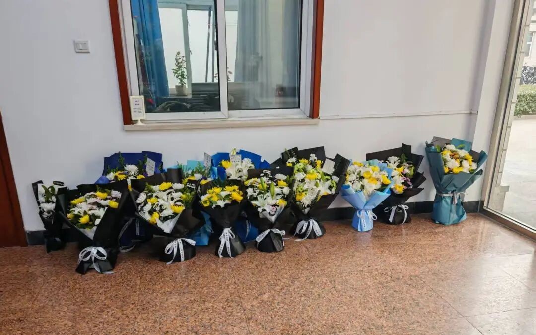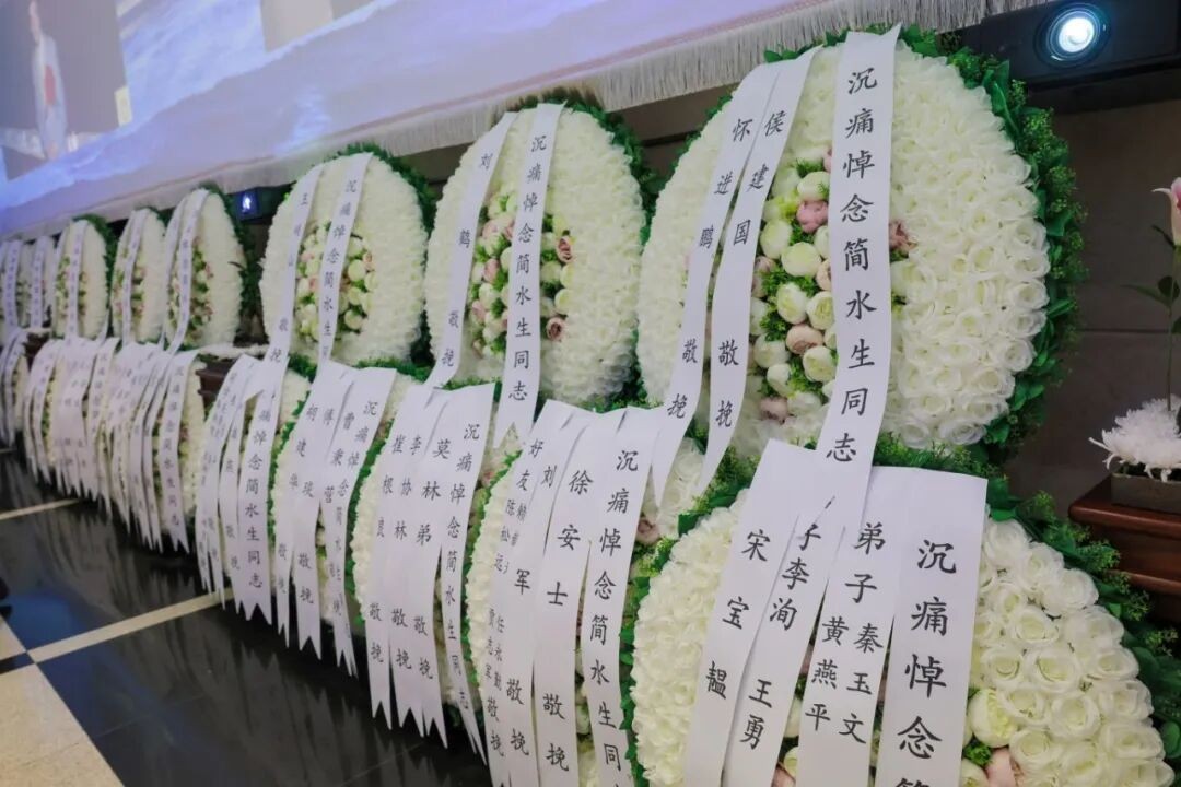 简水生院士遗体安卧于鲜花丛中,身上覆盖着鲜红的中国共产党党旗。大厅正中央悬挂着简水生院士遗像,周围摆放着社会各界敬献的花圈、挽联。大家佩戴着白花,缓缓步入东礼堂,走到简水生院士遗体前肃穆三鞠躬,与简水生院士做最后的告别。