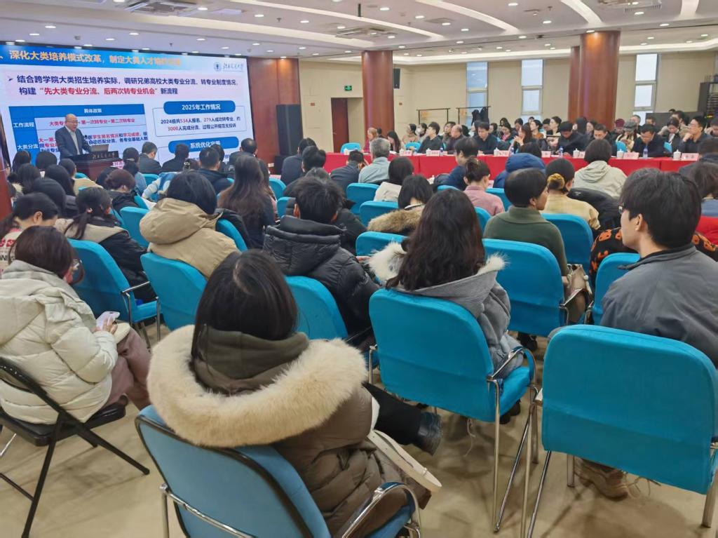 郭盛全面总结了学校2025年度本科教学重点工作的推进情况及取得的主要成果,并部署了2026年的重点工作,一是落实习思想课改革方案,深化思政育人格局建设;二是深化大类培养模式改革,优化大类人才培养方案;三是深化人工智能赋能教学,推进未来学习中心建设;四是持续优化专业布局设置,动态调整招生专业结构;五是强化一流教学内涵建设,筑牢一流人才培养根基;六是组织申报国家教学成果,推动成果转化育人成效;七是发布本科教育专项规划,强化本科教育顶层设计;八是推进雄安校区规划建设,做好一校多区教学谋划。