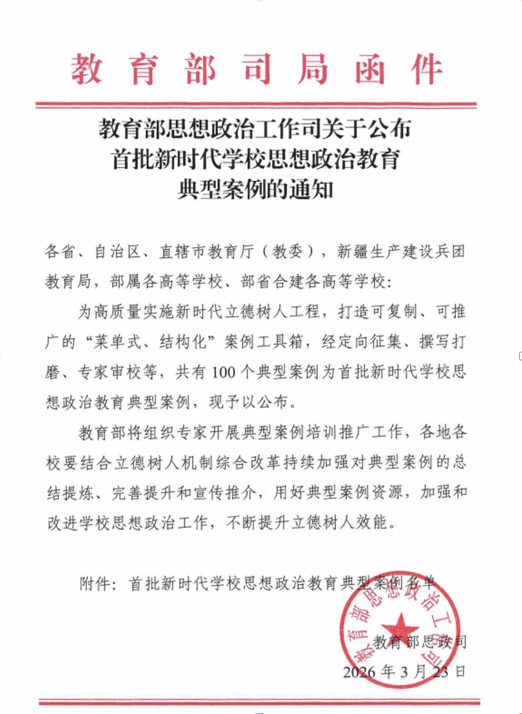 新时代学校思想政治教育典型案例是教育部高质量实施“新时代立德树人工程”的重要配套文件,旨在打造可复制、可推广的“菜单式、结构化”案例工具箱,加强和改进学校思想政治工作,不断提升立德树人效能。经教育部思政司定向征集、撰写打磨、专家审校等,共有100个。