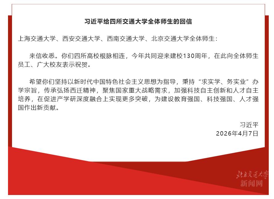 新华社北京4月7日电 近日,中共中央总书记、国家主席、中央军委主席习近平给上海交通大学、西安交通大学、西南交通大学、北京交通大学全体师生回信,对学校发展提出殷切期望。