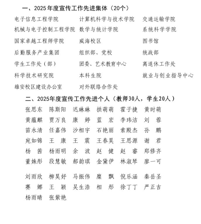 附:北京交通大学2025年度宣传工作先进集体和个人名单