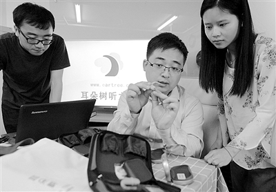 图① “五一”小长假期间,北京“耳朵树”听力健康网站的创业者赵山君(中)和同事仍在加班研究一种助听器。赵山君大学毕业后和同学一起创业,为有听力损失的儿童和老人提供听力补偿方案。公司团队大多是“90后”。