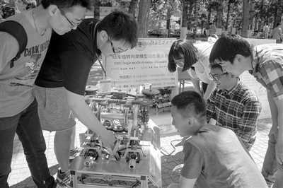 当日,北京交通大学在校园内举行了纪念五四运动96周年科技文化节活动,在“科技作品展”部分,汇集了大学生创新创业训练计划项目优秀作品、2015年创业类竞赛作品、2014年度“挑战杯”等各类竞赛获奖作品。