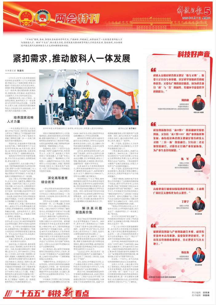 创新驱动本质上是人才驱动。全国两会期间,教育科技人才一体发展成为代表委员热议的话题。大家期待,以更大力度、在更深层次推动教育科技人才的良性互动、高效协同,为中国式现代化提供强大支撑。