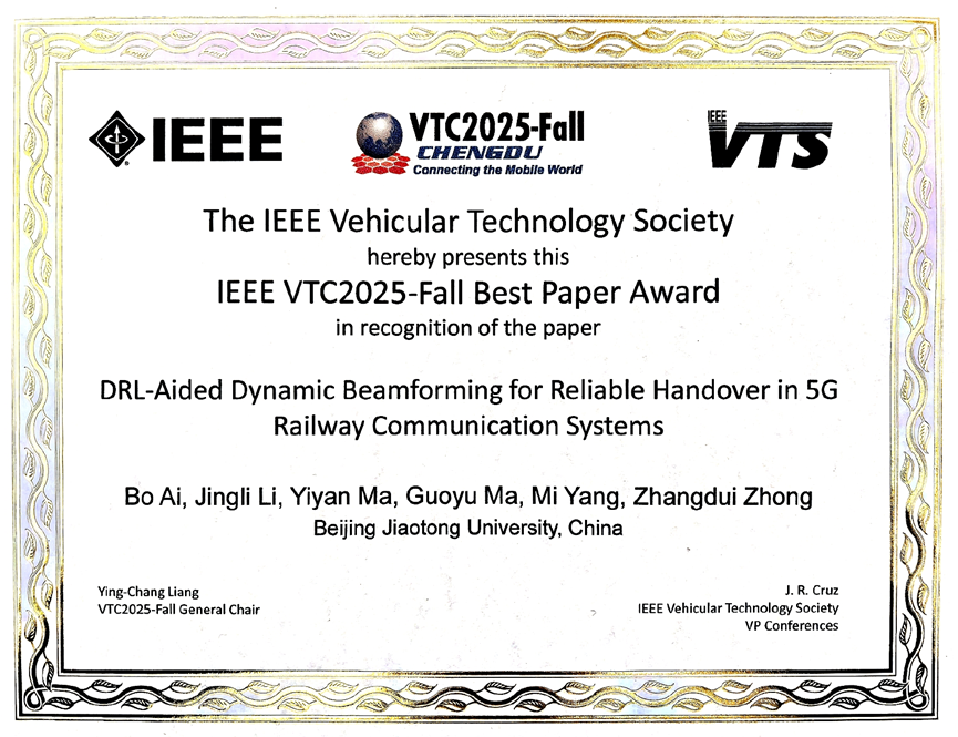 2025年10月19至22日,IEEE VTC 2025-Fall在四川成都召开。我校团队论文“DRL-Aided Dynamic Beamforming for Reliable Handover in 5G Railway Communication Systems”荣获大会唯一最佳论文奖(IEEE VTC 2025-Fall Best Paper Award)。论文创建了基于深度强化学习的动态波束成形机制,旨在减少高铁通信系统的切换失败概率并提高数据传输速率。