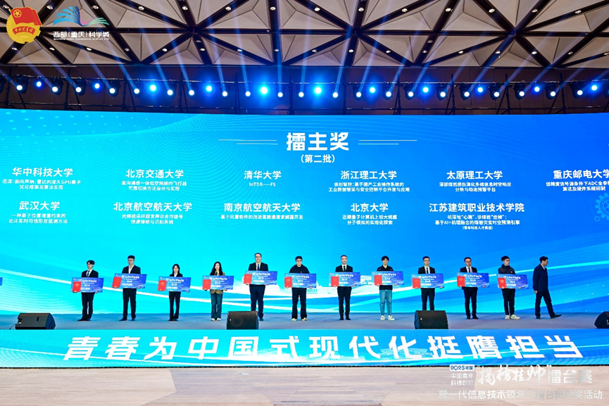 2025年10月26至28日,由共青团中央、中国科协、教育部、中国社会科学院、全国学联主办,共青团重庆市委和重庆高新区管委会承办的第十九届“挑战杯”全国大学生课外学术科技作品竞赛-2025年度中国青年科技创新“揭榜挂帅”新一代信息技术领域主擂台赛,在西部(重庆)科学城顺利举行。本赛事针对当地产业特色,发布21道揭榜挂帅技术难题,覆盖芯片设计、量子算法、空天互联等关键领域,吸引了来自全国378所高校的1200余支团队及50余支青年科技人才团队报名参赛。我校团队作品《面向通感一体低空网络的飞行器可靠切换方法设计与实现》夺得“基于低空智联网的通感算智一体化技术创新及应用”赛题全国擂主,位列本赛题全国特等奖第一位。