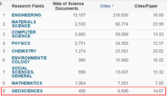 在本期ESI数据中,我校地球科学学科有论文456篇,被引用频次为6690次,篇均被引次数为14.67次,高被引论文13篇。土建学院、计算机学院、电信学院、环境学院等都为地球科学学科做出了贡献。