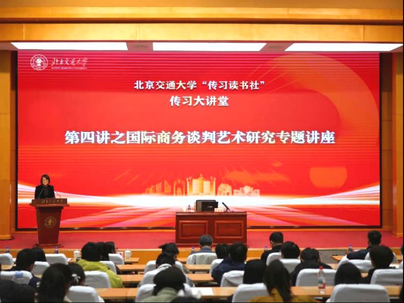 2026年3月19日下午,由北京交通大学传习读书社主办、外国语与新闻传播学院承办的“传习大讲堂”第四讲在海淀校区科学会堂举办,原总装备部退役少将蔺芳忠受邀作《国际商务谈判艺术研究》专题讲座,外国语与新闻传播学院党委书记孙文博,学校团委书记魏炜,相关单位负责同志,校院两级“传习读书社”社团成员代表、各学院学生代表共180余人参加。