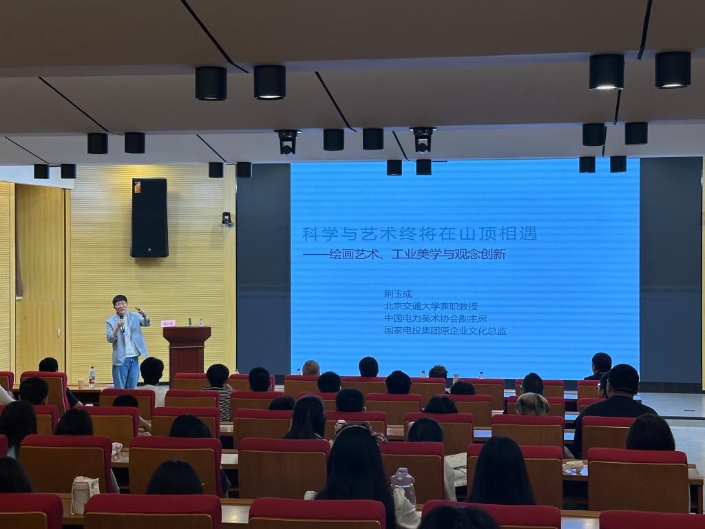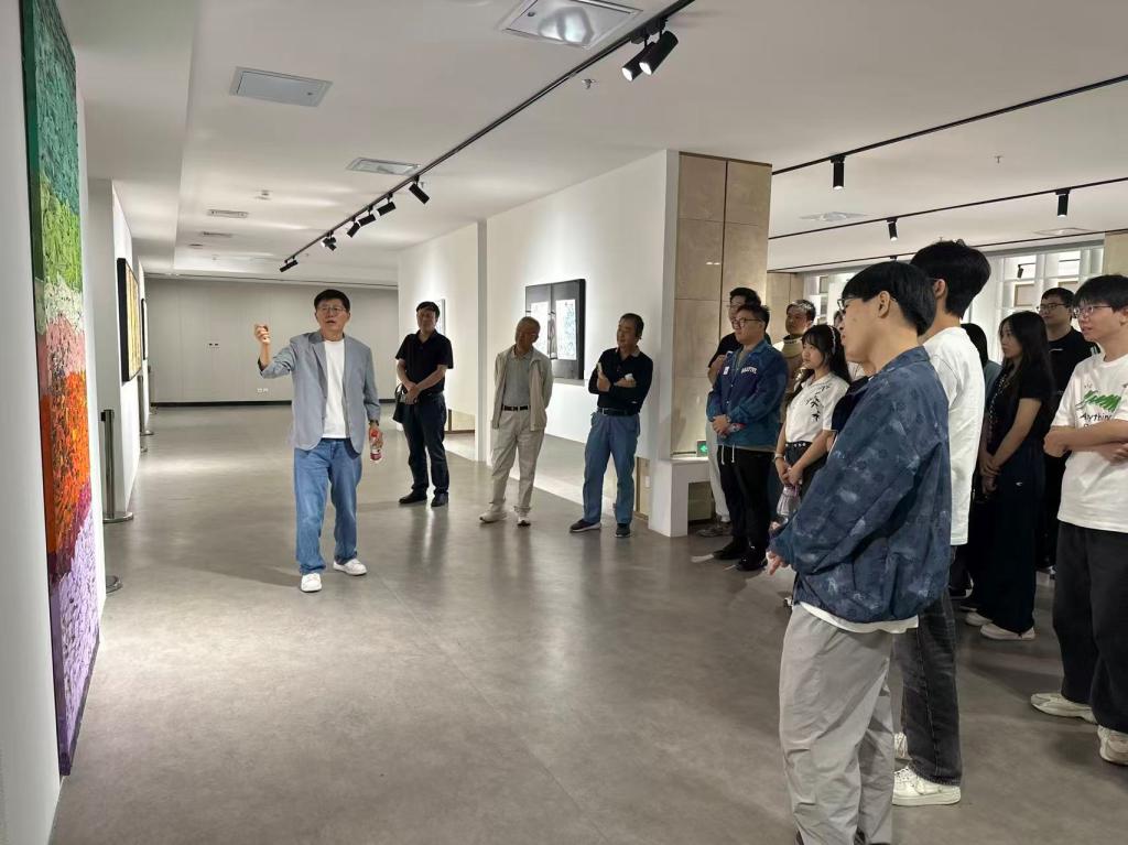 荆玉成从“人人都是艺术家”的理念出发,阐释了每个人所具有的创造性能力如何通过艺术思维参与现实生活,并指出艺术在精神慰藉、情感释放和认知拓展方面的重要价值。他结合自身的求学经历和在铁路、企业和政府的丰富工作经历,强调生活体验与人文素养是观念创新的重要源泉。他提出的“企业思想治理”新范式以及建立企业美学学科框架等一系列实践成果,为同学们提供示范与启迪。他还带领同学们参观“繁花——荆玉成的艺术世界”绘画展。