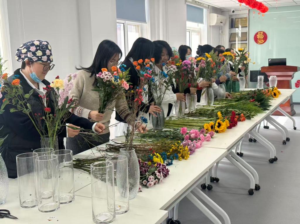 为庆祝第116个“三八”国际妇女节,丰富女职工精神文化生活,舒缓工作压力,感受花艺之美,3月6日中午,校医院工会在门诊楼三层活动室举办“芳华如花,医心向暖”三八国际妇女节花艺沙龙活动,近50名女职工欢聚一堂,共赴一场与鲜花的浪漫之约。