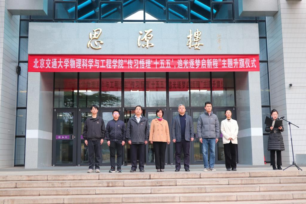 为深入学习贯彻全国两会精神,厚植青年爱国情怀,引导学院学子将个人理想融入国家“十五五”发展大局,2026年3月23日上午7点,物理工程学院在思源楼广场隆重举行“传习悟理‘十五五’,追光逐梦启新程” 主题升旗仪式。学院党委书记刘颖、院长彭继迎、党委副书记兼副院长时玉萌、学工办主任周彦君、学院团委全体辅导员、2025级全体本科生及研究生代表共同参与,仪式由周彦君主持。