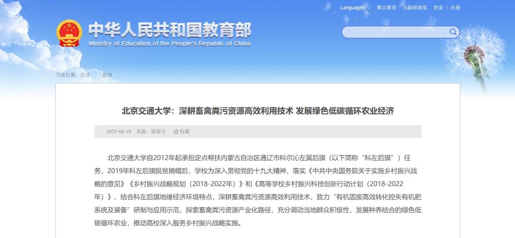 2023年4月10日,教育部官网以《北京交通大学:深耕畜禽粪污资源高效利用技术 发展绿色低碳循环农业经济》为题,单篇报道我校深耕畜禽粪污资源高效利用技术,致力“有机固废高效转化控失有机肥系统及装备”研制与应用示范的探索与实践。