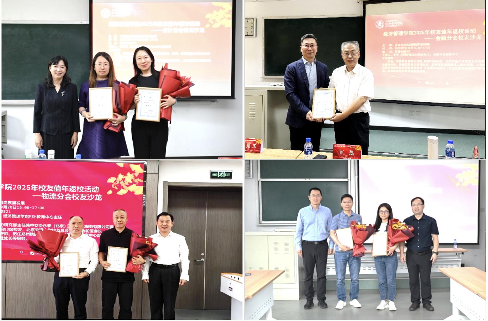 大会结束后,学院举办了多场校友沙龙与座谈会,涵盖金融、会计、物流、信管等多个领域。多位行业专家校友带来了前沿实践分享,学院领导为嘉宾颁发证书。