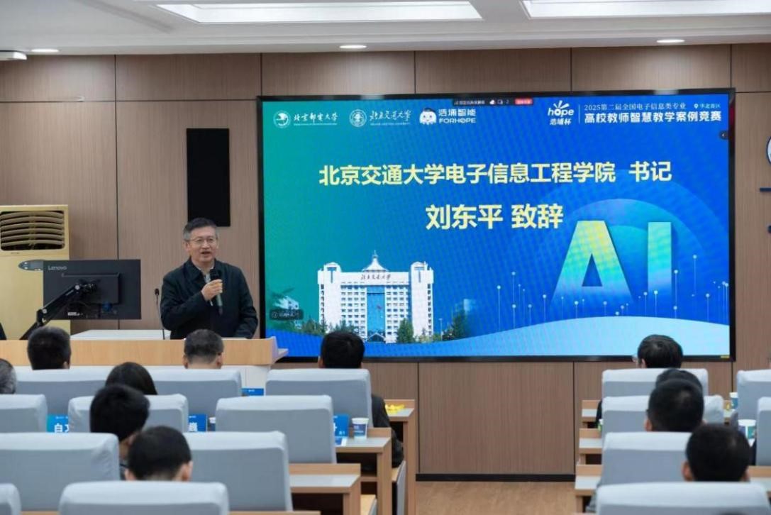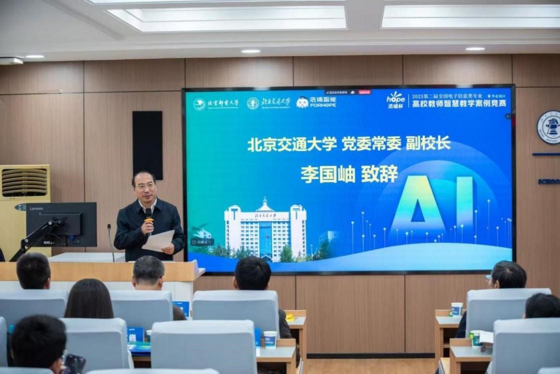 李国岫代表承办方致辞,他强调电子信息领域作为科技创新的前沿高地,智慧教学已然成为驱动教育高质量发展的核心引擎。近年来,北京交通大学始终以“技术赋能、质量为王”为行动纲领,在AI赋能教育与智慧教学实践中持续深耕。下一步学校将出台人工智能赋能教育教学行动计划,聚焦“教、学、管、评、建”五大核心维度,系统推动人工智能与教育教学的深度融合,全力打造智慧教育新生态。