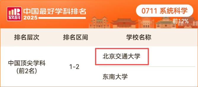 2025年10月15日,2025软科中国最好学科排名结果发布。北京交通大学此次共有24个学科上榜,其中,交通运输工程、系统科学2个学科继续稳居榜首,获评“中国顶尖学科”。我校顶尖学科数量位列全国第38名。交通运输工程连续8年蝉联全国第1;系统科学自2019年首次排名以来,连续7年位居榜首;信息与通信工程位列全国第9。