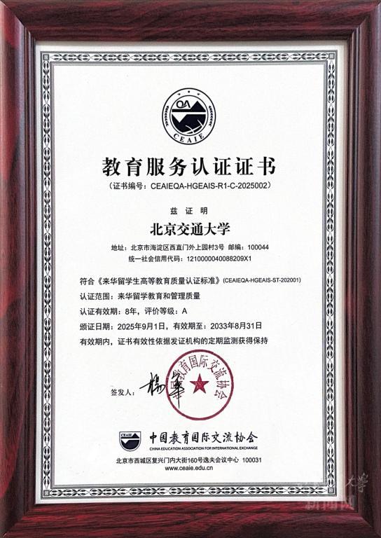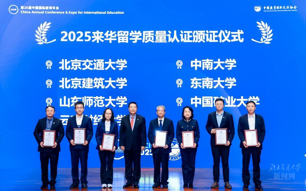 10月29日—11月1日,由中国教育国际交流协会主办的第26届中国国际教育年会在北京国家会议中心举行。在平行论坛“育见中国:来华留学高质量发展国际研讨会”上,举行了来华留学质量认证颁证仪式,北京交通大学获得最长认证有效期8年以及A级评价。中国教育国际交流协会会长刘利民向高校代表颁发了《教育服务认证证书》,学校党委常委、副校长高亮代表学校领取证书。中国教育国际交流协会副秘书长王鲁新、教育部国际合作与交流司二级巡视员席茹、来华留学质量认证专家委员会代表、兄弟高校负责人共同见证这一时刻。