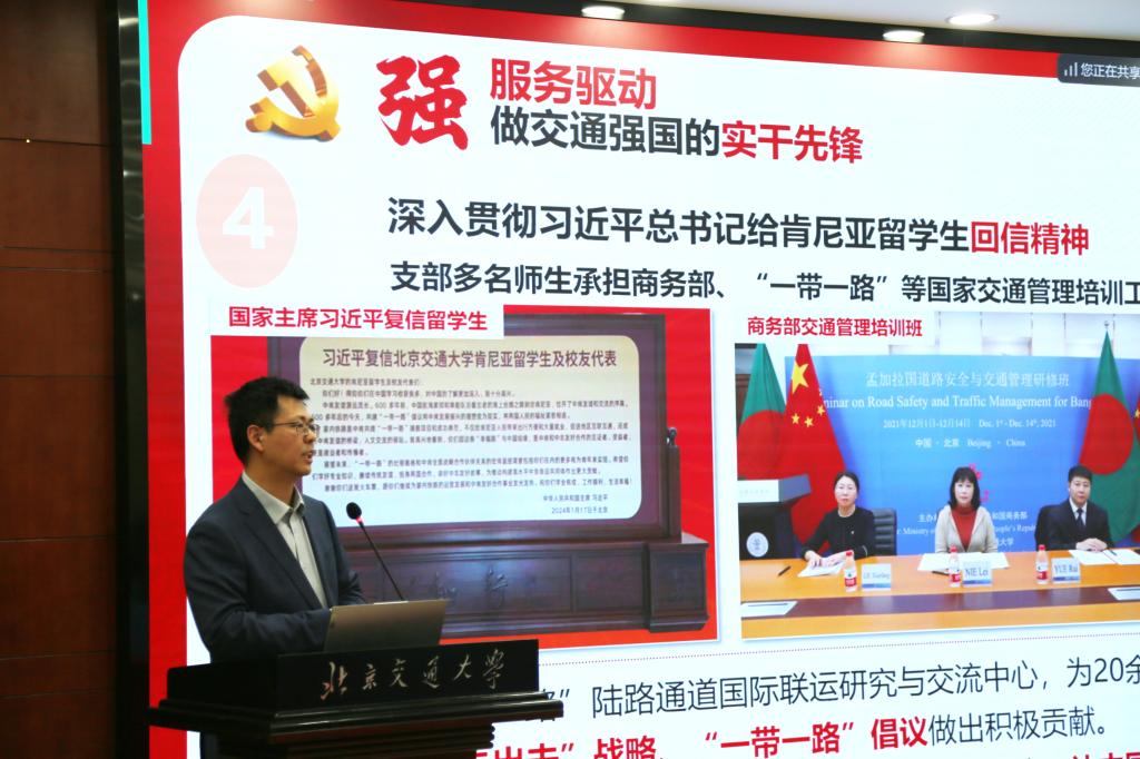 北京高校样板支部、全国高校“强国行”专项行动团队负责人、北京交通大学运输学院交通系教师党支部书记王江锋以《知交通使命行强国梦想》为题做经验交流。他指出,党支部紧密围绕学科特色,以服务国家战略需求为引领,积极探索党建与业务深度融合的有效路径,形成了“四强四先锋”的党支部工作法,引导党员争做交通强国的担当先锋、铸魂先锋、攻坚先锋和实干先锋。