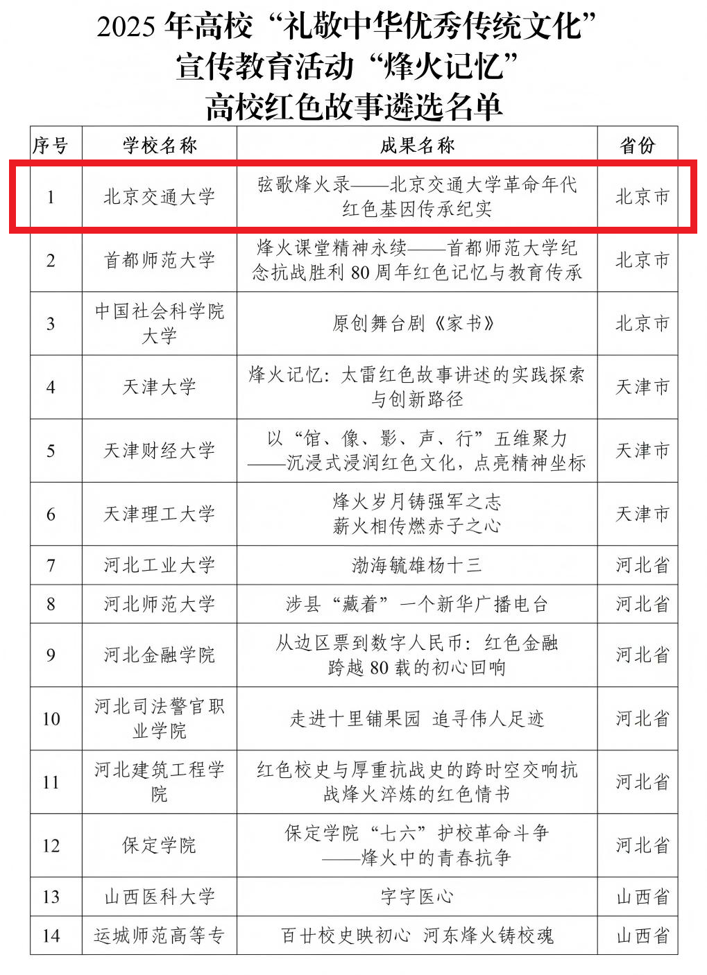 近日,教育部办公厅公布2025年高校“礼敬中华优秀传统文化”宣传教育活动遴选结果。这次活动共设置“数智未来”焕活传统文化案例、“烽火记忆”高校红色故事、“魅力非遗”原创作品三个类别,经严格评审,最终从全国高校遴选出305件优秀作品。由我校国家卓越工程师学院党委指导,黄子轩同学牵头创作的《弦歌烽火录——北京交通大学革命年代红色基因传承纪实》,在众多参评作品中脱颖而出,成功获评“烽火记忆”高校红色故事类别优秀成果。