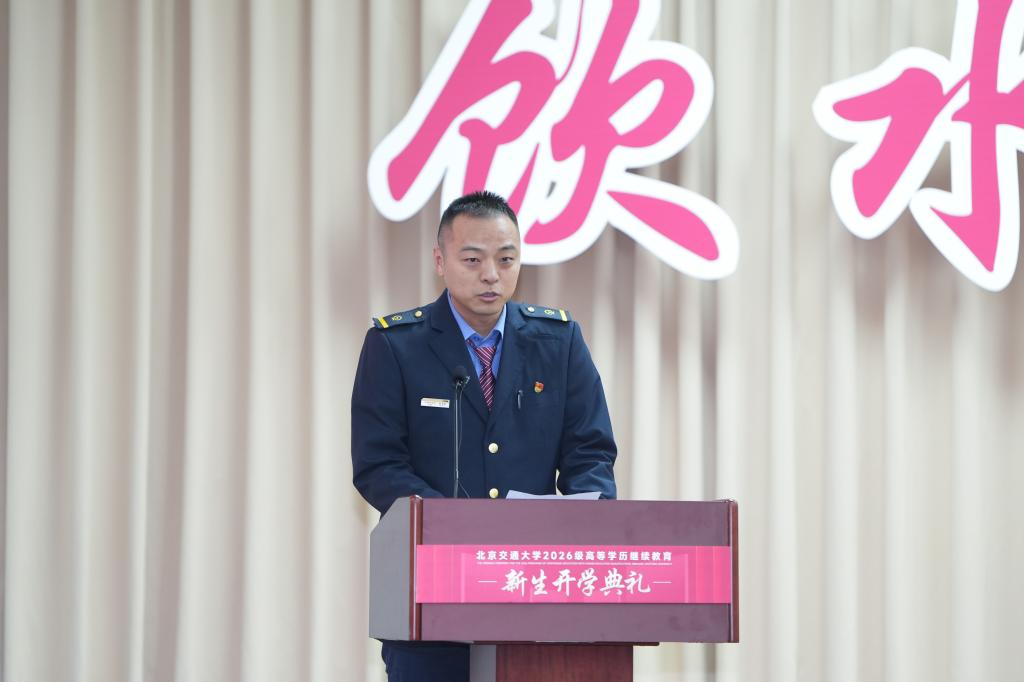 2026级新生代表、北京铁路局北京动车段的史忠彬,介绍了自己作为退役军人投身铁路工作的经历,以及在国铁数智化转型背景下重返校园的初心。