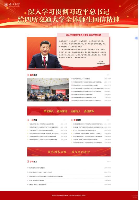 专题网站设置“最新动态”“一线声音”“媒体聚焦”“学习路上”等核心板块,及时发布学校学习贯彻习近平总书记重要回信精神的决策部署与落实举措,集中展示各单位学习贯彻习近平总书记重要回信精神的新动态、新进展、新成果,引导全体师生以重要回信精神为指引,加快推进学校高质量发展,为服务教育强国、科技强国、人才强国建设贡献交大力量。